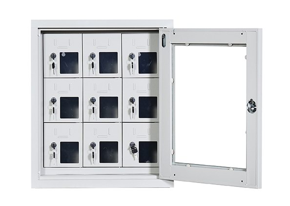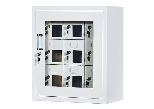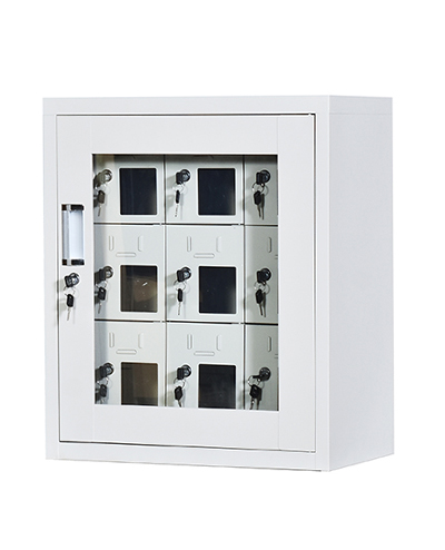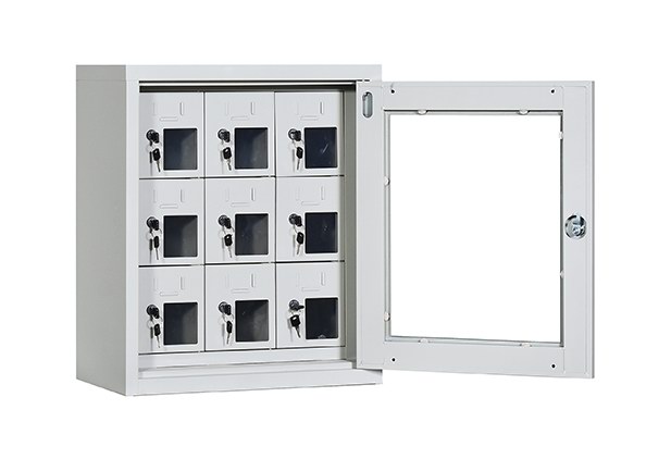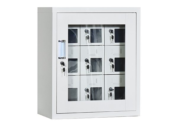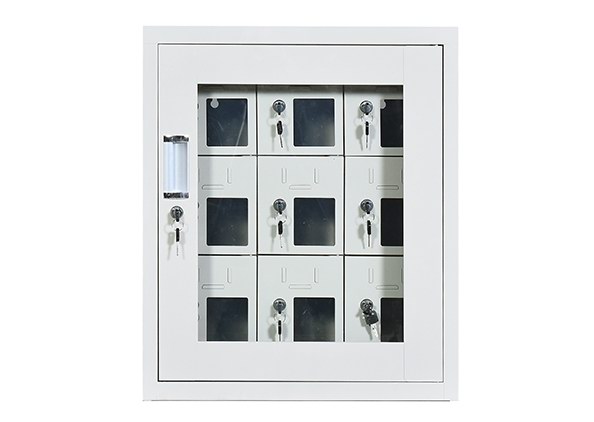 手機(jī)保密柜正面為對(duì)開金屬邊框玻璃大門,便于觀察柜內(nèi)情況,堅(jiān)固透亮,美觀大方。